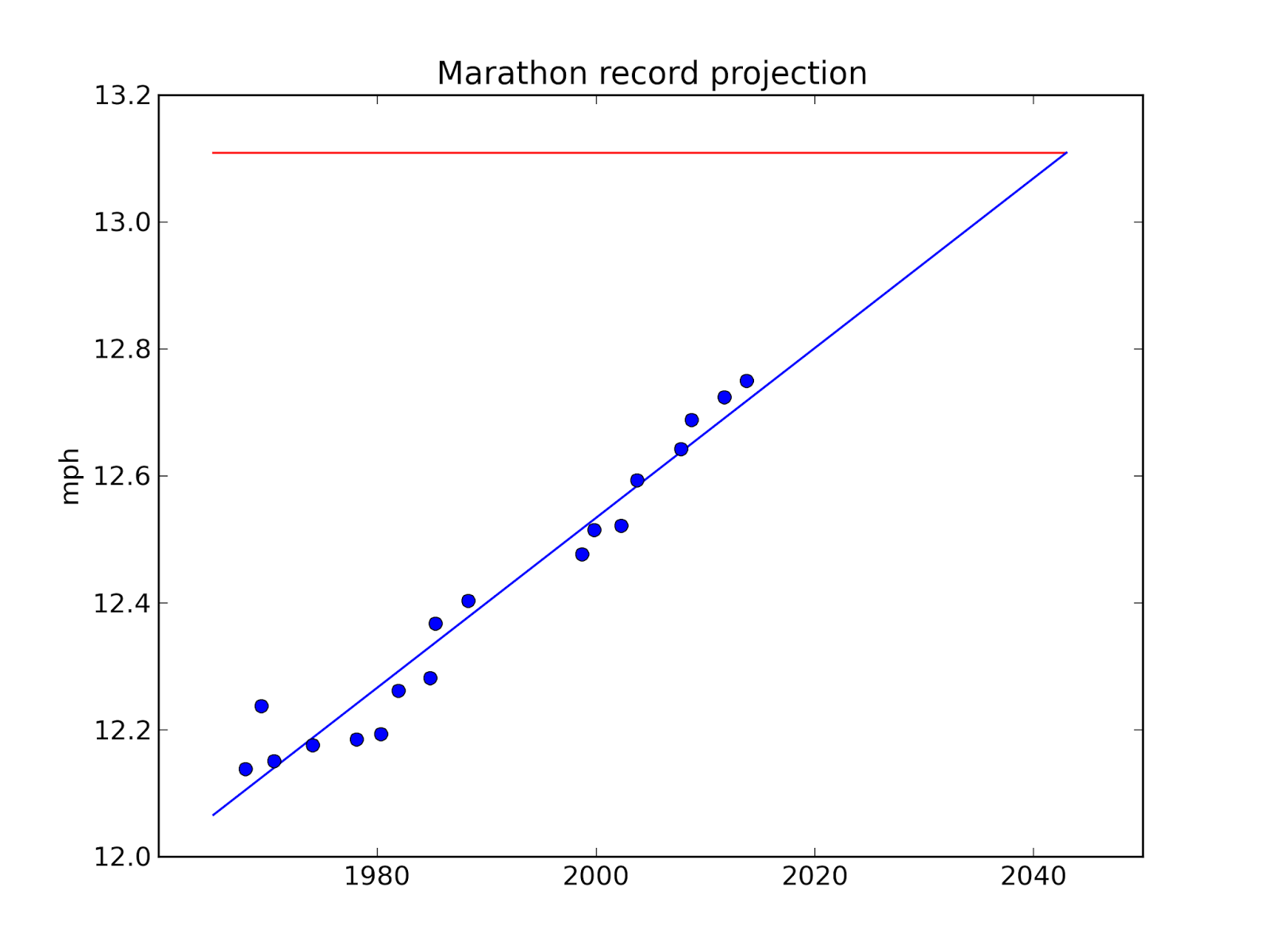 The blue points show the progression of marathon records since 1970, including Wilson Kipsang's new mark. The blue line is a least-squares fit to the data, and the red line is the target pace for a two-hour marathon, 13.1 mph. The blue line hits the target pace in 2043.In general, linear extrapolation of a time series is a dubious business, but in this case I think it is justified: