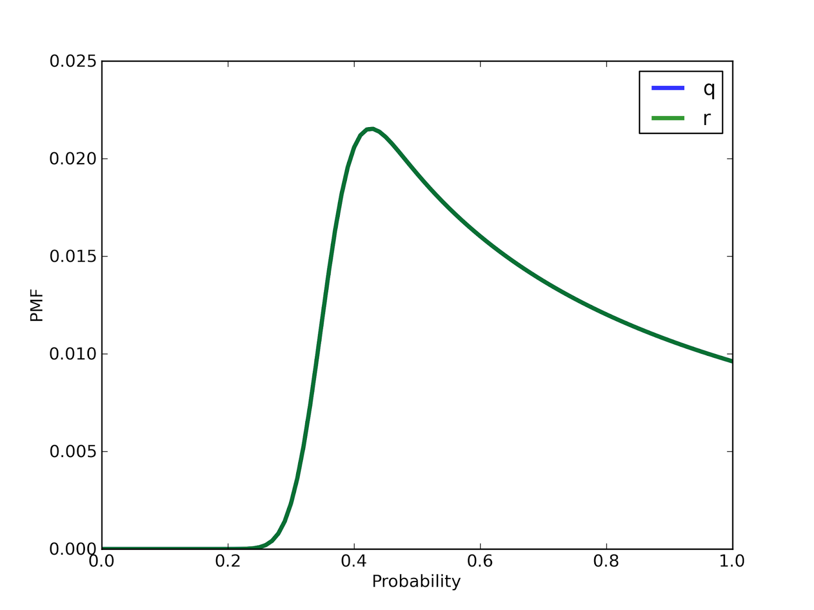 The two distributions are identical, which makes sense because this dataset doesn't give us any information about q and r separately, only about their product.