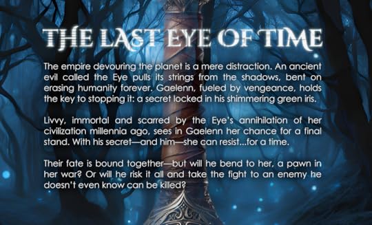 Blurb in FullThe empire devouring the planet is a mere distraction. An ancient evil called the Eye pulls its strings from the shadows, bent on erasing humanity forever. Gaelenn, fueled by vengeance, holds the key to stopping it: a secret locked in his shimmering green iris.