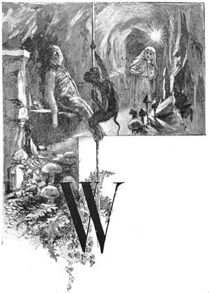 Professor Cracker struck a light, and lit a candle which he happened to have in his pocket, and by that aid we discovered a passage leading still further into the interior of the hill. This we decided to explore. Professor Cracker entered with his candle, then came Rev. Stiffbone, after him Mr Scalawag, and finally myself, each man holding on to the coat-tail of the one who preceded.
