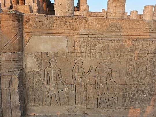 The site is dedicated to the crocodile god Sobek, god of fertility, and to the rest of his family: his wife Hathor and their son Khonsu. As I mentioned in my Instapost, crocodiles were a central element in the worship of this temple, and a problematic one, as you might imagine. The god Sobek wasn’t considered a particularly approachable guy, as you might guess, therefore the temple was balanced with a mirrored side, consecrated to another triad: a manifestation of Horus, a manifestation of Hathor, his original wife, and their son Panebtawy, lord of the two lands. This makes Kom Ombo a dual temple dedicated to a pair of triads. That’s six of them, in case you’re weak at math.