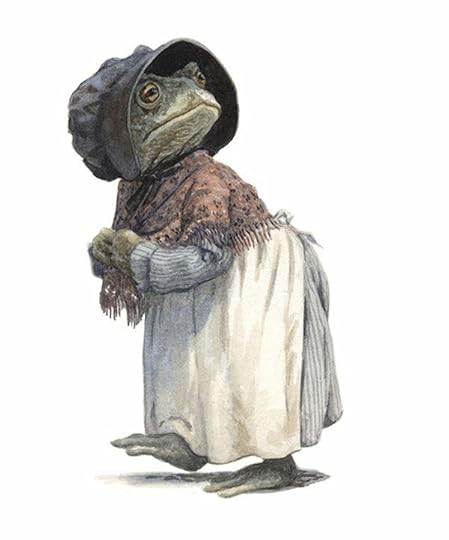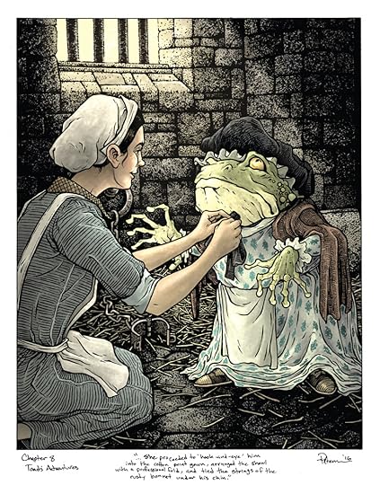 Now, Grahame is not as accurate as Potter in his description of the clothes the laundress sells Toad as a device for his escape. They’re a cotton print gown, an apron, a shawl, and a rusty black bonnet with strings that are tied under Toad’s chin. Many illustrators have tried their hand at depicting the scene. David Peterson, who worked on his illustrations for a book published by IDW around 2016, gives us a detailed account of his process in this marvellous blog post.