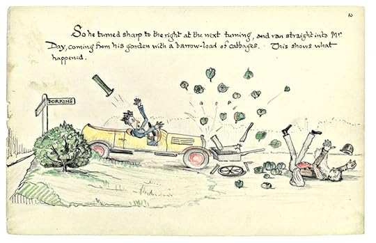After trading his silver bicycle for a yellow car, Mr Bliss’ misadventures include several accidents, but he’s immediately more sympathetic than Toad: Mr Bliss is just eccentric, not a bully, and every time he damages one of his neighbours he tries to make up for it. When he hits poor Mr Day and his barrow-load of cabbages, he haults him (and the cabbages) on his car, and does the same with Mrs Knight and her donkey-cart of bananas.