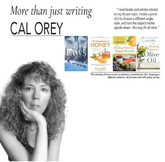 Cal Orey, M.A. is an author and non-fiction novelist. Her books include the Healing Powers Series (Vinegar, Olive Oil, Chocolate, Honey, Coffee, Tea, Superfoods, Essential Oils, Herbs and Spices) published by Kensington. (The collection has been featured by the Good Cook Book Club.) Orey’s new book is Soulmates with Paws. [Followed by Courage with Paws, Time-Traveling Tabby, and The Ghost Ships trilogy]