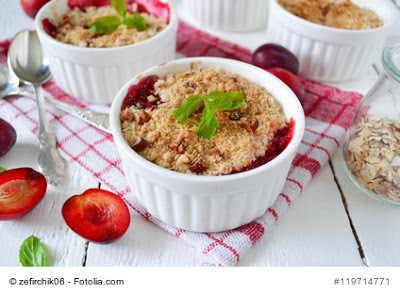 Pre-order fixed price guaranteePreheat oven to 350 degrees. In a bowl put chopped fruit. Add sugar, flour, cinnamon, and juice. Mix well. Set aside. In another bowl, combine butter, sugar, oats, flour. and nuts. Dish fruit evenly into ramekins. Top each with crumbly topping. Bake approximately one hour. (If you live in high altitude it may take a bit longer.). It's done when crust is golden brown and fruit is tender and bubbly. Best served warm with a dollop of whipped cream. Serves four.Making a plum tart or apple pie in May seems a bit off, but creating simple fruit crumble dishes works whether it’s chilly or not. The oatmeal makes it crumbly not sugary like a fruit crisp. Served warm with coffee for breakfast or cold with iced tea for dessert definitely works. Come summertime repeat with blackberries or rhubarb. It’s a sweet and comfort food from nature’s finest for life in the mountains and guaranteed to please whatever Mother Nature decides to do.