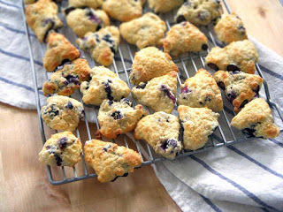 When I was up by four A.M., and checked in at the Montreal-Pierre Elliott Trudeau International Airport and waited to board the plane to take me back home, I ordered a latte and blueberry scone—a large triangle-shaped gemcake-like semisweet quick bread (glazed or plain served with butter). It was in one of those big glass jars. The cafe owner told me, “Everyone loves them.” The texture was a bittersweet surprise. Each bite was like a rich butter cookie, not cake-like or moist. It was sweet enough and big enough with an unexpected crunch. I, the California fussy scone girl, thought, “Ah, but she hasn’t tasted my sweet scones.” I vowed once back home snug in my cabin, inspired by the Canadian savory and sweet scone, I’d bake up a batch of fresh blueberry scones and match its look and taste.Blueberry Vinegar Scones