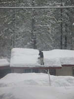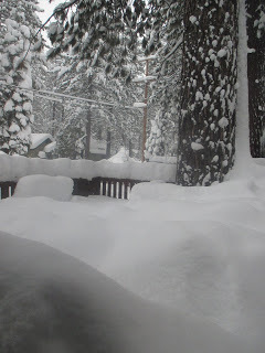 January 15Then, one more storm slams the sierras. Tourists are happy and hotels are filled. It is a real winter like mountain folks said we used to get. The snow piles up on the deck, and berms pile on fences so I can no longer see neighbors due to the snow fortress. With a mix of rain and snow, shoveling snow is no longer easy to do. Snow is building up on the rooftops and ice dams are dripping water at the doorsteps making it slippery to walk and taking the dog out is now a dangerous task late at night and early in the morning. Dirt and debris in the snow on the deck is an eyesore.