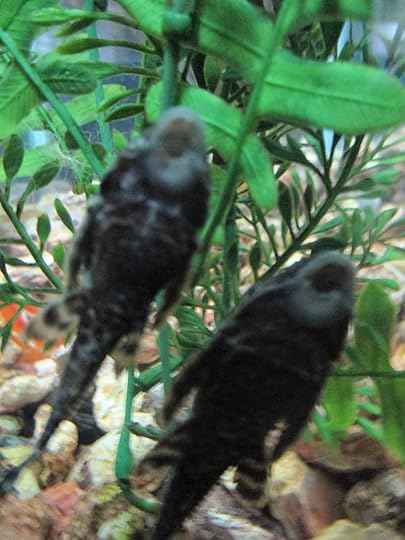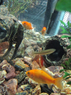 THE REPLACEMENTS: Last Sunday I lost Marley, my beloved happy pleco. I still miss the fish-human bond. He made me happy. The next day, I replaced him with two new bottom feeders. This duo seem attached (related or perhaps because they are from the same aquarium); I'm keeping distance and guarding my heart. And speaking of God's creatures, I am already feeling that void if I go to Southern California I'll be leaving the cat and two dogs-- my boys. It's likely more challenging for me than them but I'm sure we all will feel the change and void. So far, these nocturnal fish seem to be doing fine with the goldfish. No names until I know they're here for the long term.