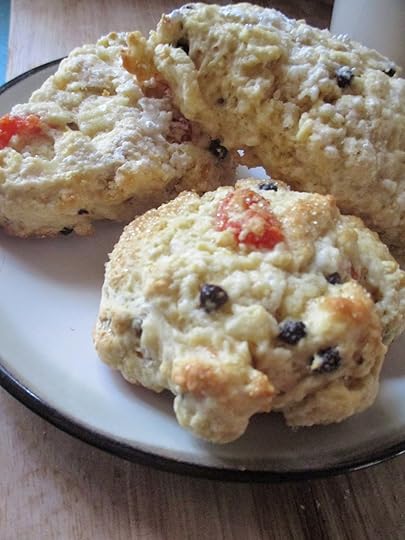 Both drop scones and rustic triangle shapedworked: fresh and warm buttery, tart current-apricot