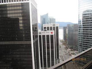 Waking up in B.C... At home each day I awaken to three sweet but demanding fur kids. I am nestled amid pine trees (and a receding beach at Lake Tahoe a few blocks away). In every room of the cabin each window I look out of boasts towering trees (minus one that fell on the cabin last December). On Sunday last month it was a breath of fresh air to open my eyes to a solo bed with a city view and water. This corner room on the 24th floor boasted a balcony which I did learn to savor. Most of the time I was in the room the door was open and fresh air and space was awesome to my senses.