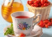 Rosehip and Cranberry Tea* * * 2 cup water 1 1/2 cups cranberry juice 1 clove 2 rose hip tea bags, or 2 rose hip-blend tea bags 2 tablespoons clover honey 2 orange slices garnish