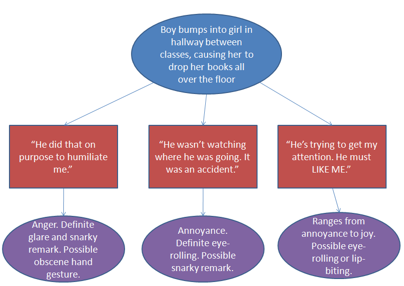 Assume that, in this situation, it's really not clear from the guy's facial expression or body language whether he did it on purpose or not, at least, if you were watching from the outside. She has to rely on her own conclusions about what's happened. Depending on the girl's attribution of the guy's intent, she might feel and respond very differently. And with this single situation, I can think of at least a few more attributions that would lead to even more varied responses (like, the girl decides it was actually all her fault for running into the boy, and feels ashamed of herself and sad).