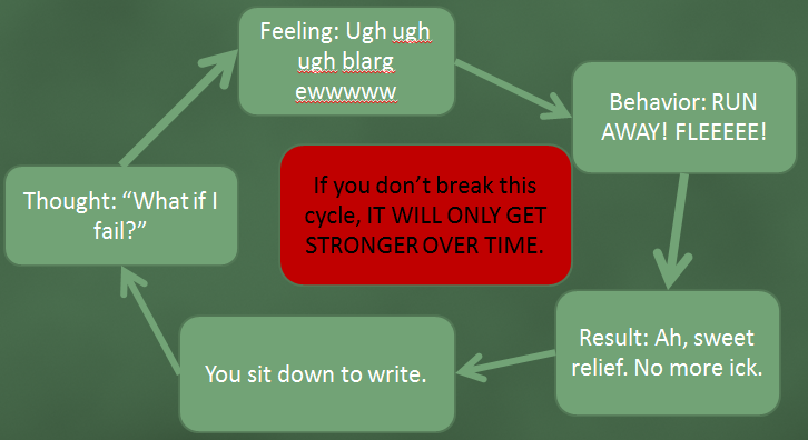 Avoidance: A very common flavor, judging by all of your responses! Here, we're talking about sitting down to write and having an unpleasant thought (one you *might* not even know you're having, but in the diagram above, "I'll still be far from the finish line" and "I'm going to have to rewrite the whole thing" and "I'll never be as awesome as so-and-so" are examples), and it feels bad! So you ... avoid it!