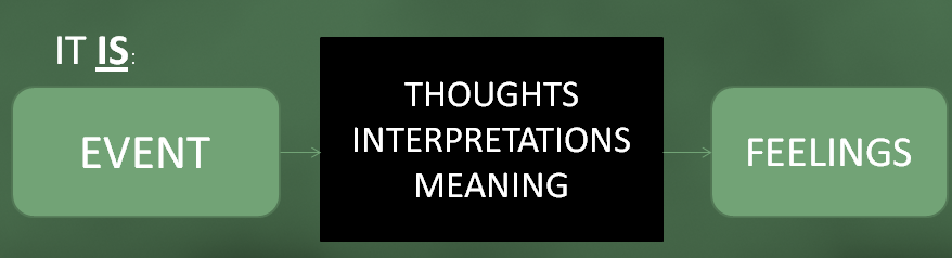 In other words, whatever drives your feelings--depression, anxiety, frustration, restlessness--doesn't come directly from an event (like rejection, or a negative review, or the fact that you've been trying to write the same scene for the past four weeks). Feelings come from that black box above. See it? Your thoughts. How you interpret the event.
