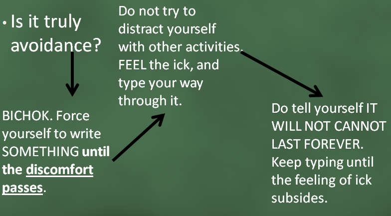 When you're dealing with the avoidance flavor of writer's block, there is only one way through it, and that's ... to go through it. To confront it head-on. That DOES NOT mean you ignore the thoughts that are making you avoid. It means the opposite! You have to acknowledge the thoughts, feel the feelings, and write anyway.