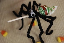 Spider Pop- Cut up a black trash bag into 4 inch squares – just enough to cover the number of spiders you want to make. If you cut a 4 inch strip off of the top of the bag you will still be able to use the rest of the bag. Wrap the black plastic square over a Tootsie pop. Twist 4 black pipe cleaners over the plastic to hold it in place, then spread the pipe cleaners out to create spider legs. Bend the legs once to form ‘knees’ and then again at the bottom to form feet. Now your spider treats are done. If you are short on pipe cleaners you can get by using just 3 pipe cleaners per spider, as most people won’t count the legs. These treats are also great to hand out for trick-or-treaters on Halloween night.