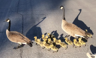 Living in the Mojave Desert, I don't see a lot of waterfowl, but I did the other day. While on a walk through my subdivision, I encountered a large family from Canada. Papa Goose, Mama Goose, and their seventeen babies seemed hellbent on seeing the sights and making their way to a busy road at rush hour. With the help of several neighbors, I managed to scoot the birds from a side street to a greenspace, safe from cars. It was just another day in Las Vegas.