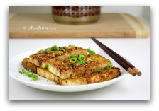 1# Firm tofu sliced into 12 squaresSauce: mix all together4 chopped scallions5 TBS soy sauce2-4 minced garlic cloves1 tsp Korean red chili pepper1 Tbs. mirin2 tsp. toasted sesame seedsBlack pepper ½ tsp sugarAdd 3 Tbs vegetable oil to a large saute pan and fry the tofu till golden brown on each side. This takes a while so be patient, don’t keep flipping the tofu back and forth. Let it sit till nice and crispy.Transfer the tofu to a lidded pot and set over medium heat and pour the sauce over the tofu and gently stir till coated. Cover with lid and steam for 5 minutes.Serve with rice or just keep in the frig for a quick snack.