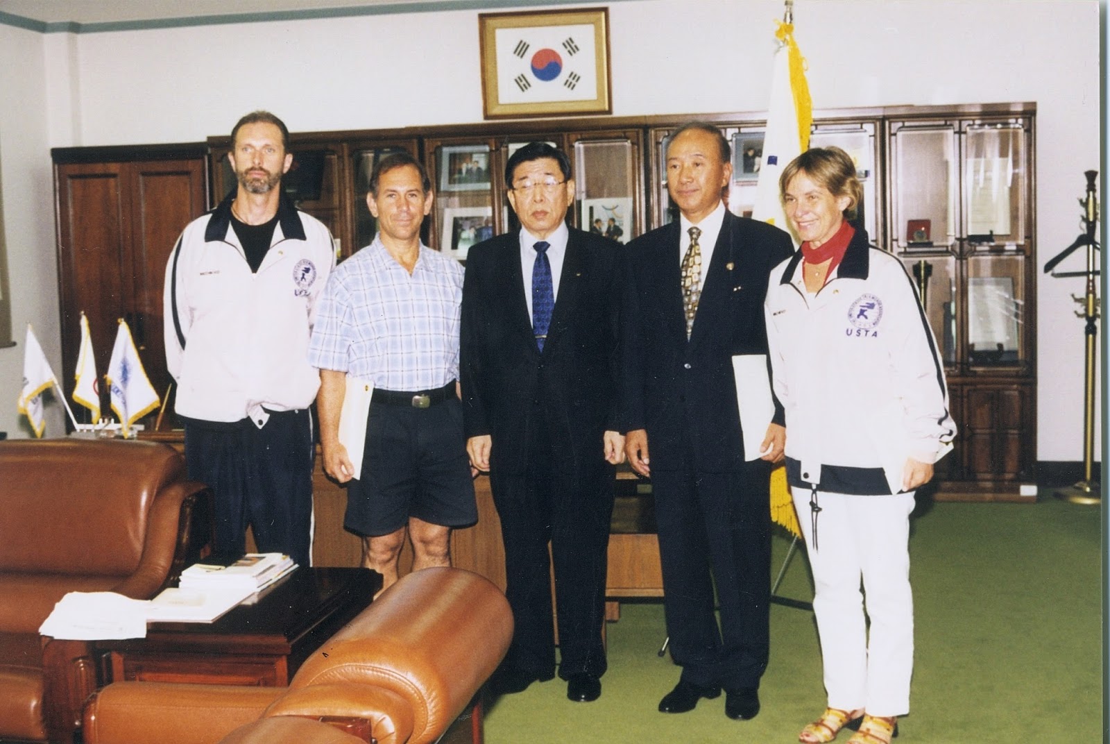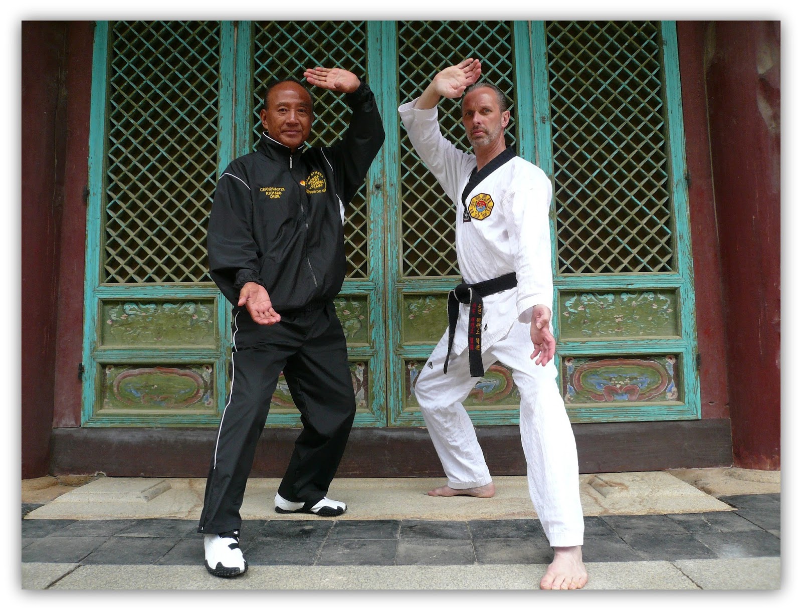 Kukkiwon with Dr. Un Yong Kim (center)dimensions until today, modern educational institutes of higher learning located in Korea offer Taekwondology, along with its comprehensive syllabus of technique, tradition, rules and regulations, as a major. Regardless of the fact that the roots of tae kwon do date back to antiquity, historians agree that during the mid-twentieth century, the primordial forms of the art then known as kong soo do, tang soo do and for a brief period of time, tae soo do, were heavily influenced by Okinawan karate-do coupled with Chinese chuan fa, Japanese judo and, to some degree, aikido and jujutsu. While in transition, ritual and practice fortifying the burgeoning discipline innocently drew breath from these styles. Then, just as the citizenry of the Korean nation were given the opportunity to reestablish their cultural and technical infrastructure - admittedly after immeasurable strife and bloodshed - so too did tae kwon do. Rising like a phoenix from the ashes of war, the disparate styles that evolved into the single, standardized national treasure that we know today, took on its own identity within the pantheon of Asian combat disciplines. Distinctive skills and strategies featuring philosophical underpinnings exclusive to Korean culture clearly began to emerge. This process was not easy and came at great cost, both socially and politically, to many of its founders and the organizations they would come to create. Yet, today, tae kwon do stands tall as a battle-proven form of self-defense and a fully recognized Olympic sport boasting a growth curve second to none, crystallized in the span of a short sixty years. Miracles of this magnitude cannot be accomplished purely on a physical level. Rather, planning, forethought and the accumulation of knowledge must be converted into action; action stoked by the uncorrupted transmission of wisdom across generations. Lessons learned in battle during the Silla (57 BC-AD 935), Koryo (918-1392) and Chosun (1392-1910) dynasties, exemplified by warriors of the Hwarang and preserved by fighting Buddhist monks called on to defend the nation against Japanese invaders in the late 1500s, are as valid today as they were then. Couple these tactics with a contemporary understanding of physiology, sports medicine and body mechanics, and a valid blueprint of academic standards begins to materialize. The academic approach to tae kwon do becomes abundantly clear as one sifts through the many editorial contributions offered by scholars, masters and enlightened practitioners dedicated to the worldwide proliferation of the art. Through the magic of the Internet, technique, decorum and training rituals have been exhaustively documented for current and future use. Books, treatises and dissertations have been written to intellectually support routines and principles. These, amplified by visual aids, amount to a supreme body of knowledge that can quite literally take a lifetime to absorb. Great men and women come to mind who have generously contributed to this paradigm of data - more than not, at little or no personal gain above that of serving the art. Highly qualified individuals such as Richard Chun, Sang Kyu Shim, Kyong Myong Lee, Son Duk Sung, and Sihak Henry Cho share this distinction with others too numerous to mention.