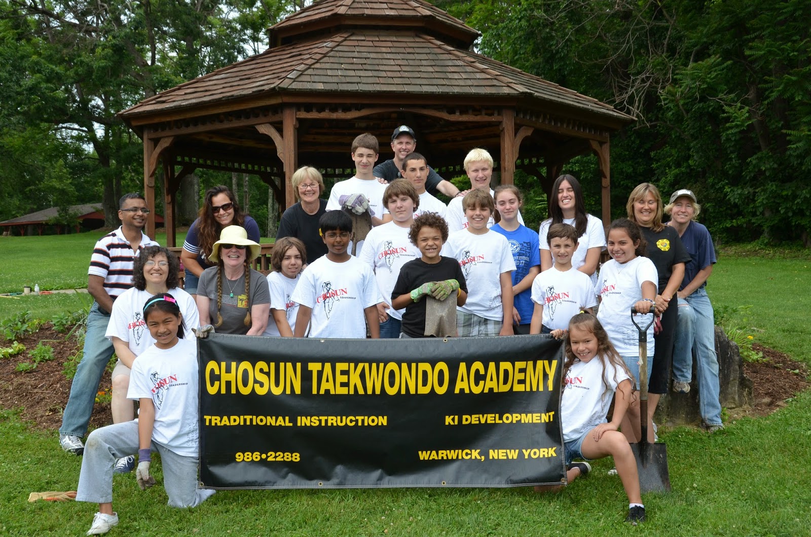 The Chosun Taekwondo Academy Leadership TeamThere’s a charming wooden gazebo in the Warwick Town Park, surrounded by colorful flowers, with an engraved marble bench next to it that catches many a shade-seeker’s curiosity.“It has long been my dream,” the bench reads, “that one day Americans of all ages, creeds, and colors, will be practicing taijiquan in the parks of this nation as they do in China. The result would be a tremendous improvement in mental health and physical well-being. It is my hope that we can work together to revive taijiquan which is fast becoming a lost art.” What is taijiquan? And who is this enigmatic Master Jou Tsung Hwa, “scholar, teacher,[image error] author, dreamer?” Taijiquan, it turns out, is tai chi, the slow-moving martial art you see old folks practicing if you ever take a stroll through Chinatown in the morning. Master Jou was a world renowned teacher of the art, and the creator of the 103-acre Tai Chi Farm on Route 94 – an international mecca for tai chi practitioners and a landmark in Warwick. People came from around the world to practice and live on his property. The era of the Tai Chi Farm came to a close in 1998 when Master Jou died in a car accident. Even though he was in his 80s, Master Jou was still full of life and energy, and his death took the community by surprise. His disciples came together to build a gazebo in his honor. Over time, though, the flowers planted around the perimeter began to wilt. Students from the Chosun Taekwondo Academy, who practiced in front of the gazebo during the summer, took notice. This was a job for the Chosun Taekwondo Academy Leadership Team! The team consists of dedicated young martial artists who are cultivating leadership skills and enriching the lives of our citizens through selfless service to the community. The members of the team worked hard to gather donated plants and set out to fully refurbish the area. It was a huge success and a great way to not only add to the natural beauty of the area but to help honor Master Jou and preserve a valuable part of our local history.“The area was just transformed ,” said director of the team, Chosun 4th Dan Master, Cheryl Crouchen. It’s turned into a tradition to clean up around the gazebo every spring to honor Master Jou. Early on a Sunday morning in May, The Chosun Leadership Team and families happily weeded, raked and planted annuals, keeping this mystical piece of Warwick’s history alive.A version of this article, written by Ashley Smith appeared in Dirt Magazine July 2014