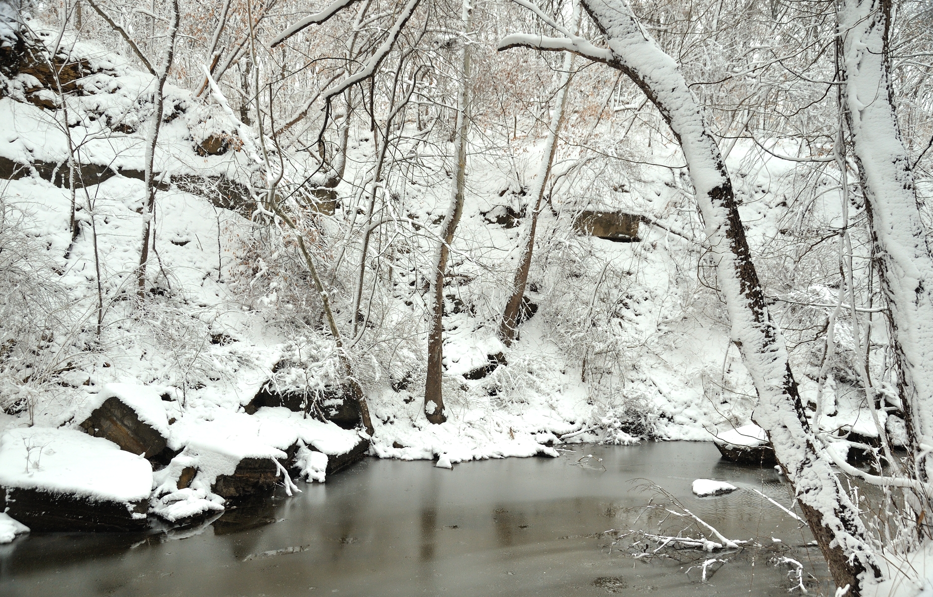 For those who are interested, the snow acts as an insulator and keeps the ice from freezing as solidly as it otherwise might. Throw in moving water, and suddenly gravity does the rest. My right foot broke through the ice and took a plunge into the frigid water.