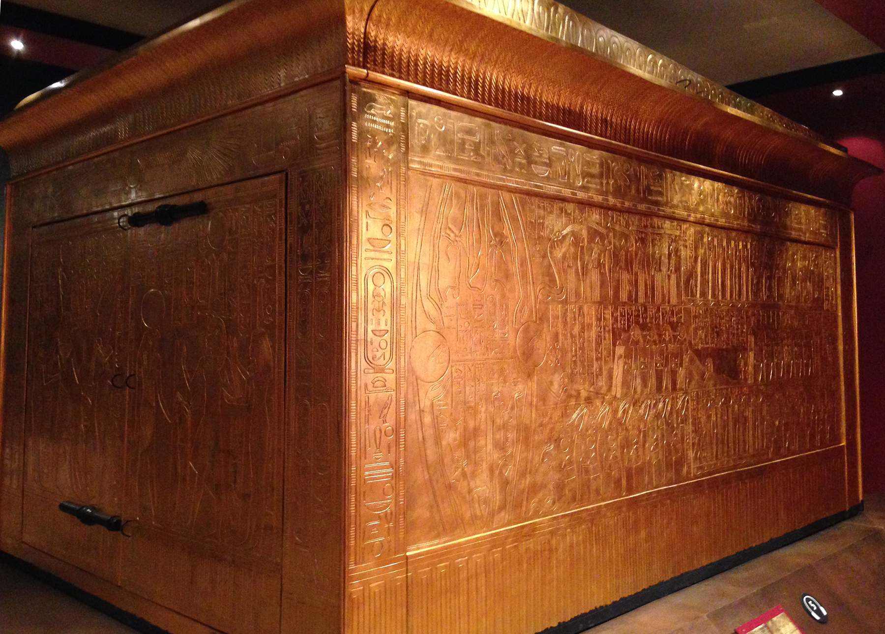 Then the exhibit displays the large shrines, each made of wood, covered in plaster, carved, and then plated in gold. There were actually four shrines, each nested one within the other. And inside of all the shrines were the sarcophagi. There were three of these, each also nested one inside the other, with the innermost one solid gold.