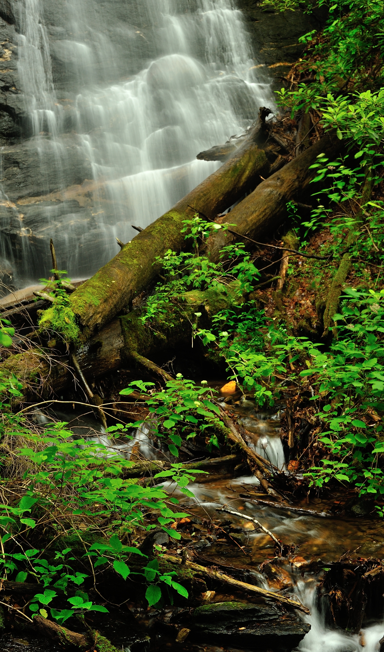 The picture to the left was taken an hour later on the same hike. I liked how the water was falling into a pool filled with logs and debris. The green of the moss and leaves offered a nice contrast to the browns and grays.