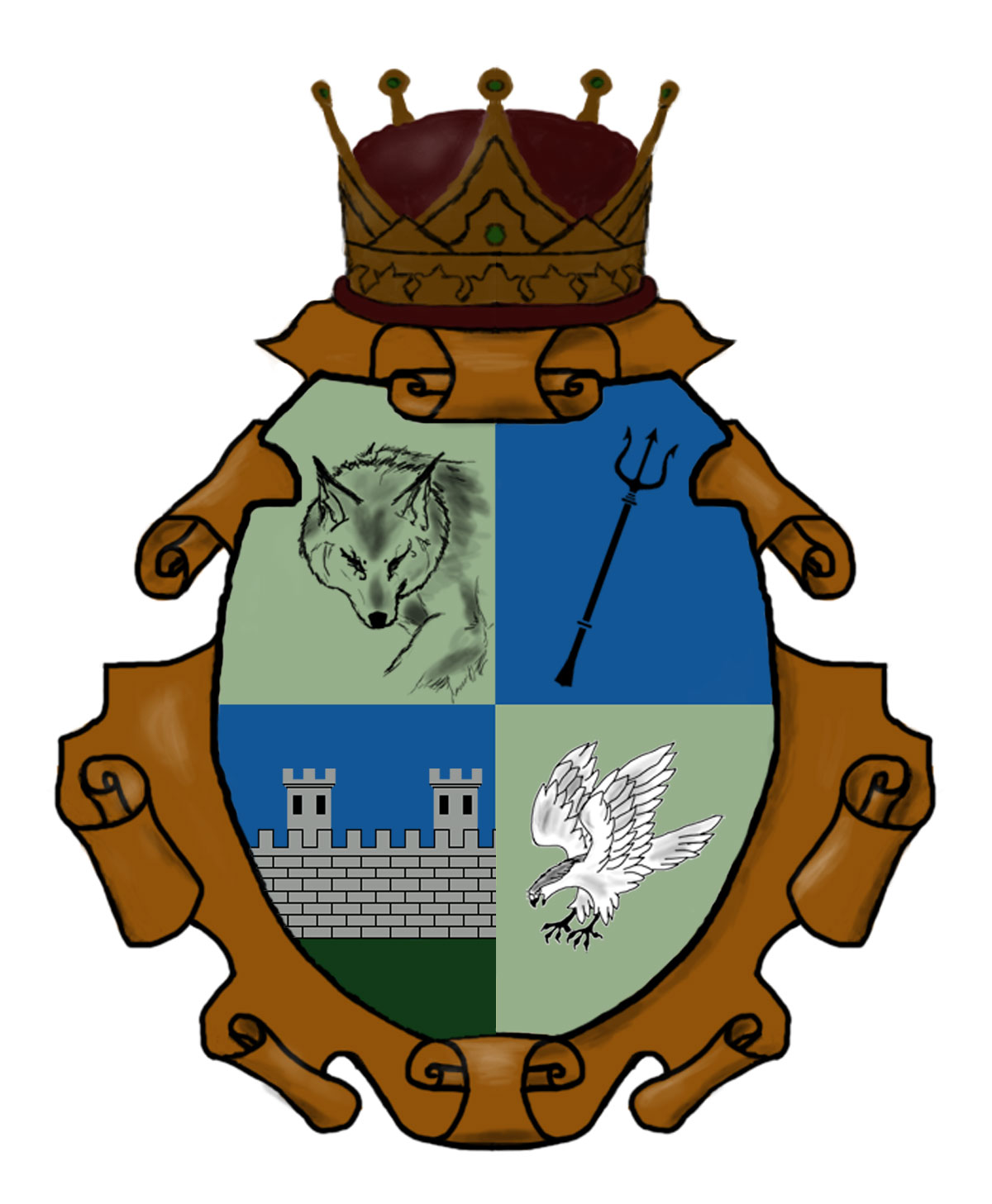 The trident on a blue field came from my grandmother Kara’s grandfather Gravhir Enishson, who was King of Calis when Calis became a great naval power. This symbol of naval power came into my family when my grandfather, King Morgan, adopted the trident to honor his wife Kara and my father kept it to honor his mother.