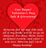 To thank you for your taking the time to leave a review, Lisa Rayns is having a huge sale and a giveaway all month long.