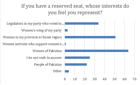 In an online survey my team conducted, women elected representatives report being denied opportunities to speak and coming under pressure to tow the party line. Yet when asked whose interests they believe they represent, 75 per cent cited women in their home region, women of Pakistan, or the people of Pakistan – and only 19 per cent felt accountable to the party colleagues who elected them. So far, the outcomes of their work as legislators bear this out.