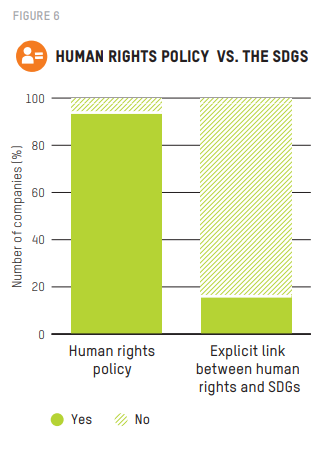 Human rights: Despite the strong link between human rights and sustainable development, few companies are marrying their human rights commitment with their contribution to the SDGs. Only five companies in our sample display a strong emphasis on human rights in their support of the SDGs (although the vast majority of companies has a human rights policy). This finding confirms the potential risk of SDGs evolving into a diverging direction from the Business and Human Rights agenda. (Figure 6)