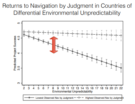 This matters because ‘As environments become more unpredictable and interventions less externally verifiable, the flaws of principal control weigh IDO projects down more heavily than do the weaknesses of fallible agent judgment. When the going gets tough, Navigation by Judgment helps cope with the rougher terrain.’ So in messy places like fragile/conflict states, IDOs that navigate by judgement do better than their more rigid colleagues, even though both groups find life harder than in stable places.