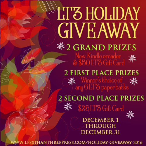 It’s that time of year again! Less Than Three Press would like to wish you a very happy holiday season! To celebrate the end of the year and all the holidays therein, we’re doing our ever-popular raffle and sale! You can save 15% off ebooks and an additional 15% off preorders of our upcoming releases. You can also save the usual 25% off paperbacks. This sale runs all month long (December 1 through December 31), which gives you plenty of time to stock up on new books for ho...