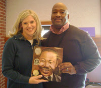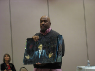 Bryan Collier spoke about his life growing up with his brothers, and how all he wanted was to be a basketball player. Until, one day, he found himself in an art class and realized that that was his purpose. He moved into his grandmother's house and worked on his art projects. While living there, he noticed that she made these beautiful quilts that had landscapes and pictures sewn into them. He didn't understand why he wanted to make the art that he was doing- it just felt right. He moved away from his family and embarked upon the adventure of finding someone who wanted to work with him. Bryan said that he went one day a week for seven years knocking on doors, until someone answered. Again, the rest is history.