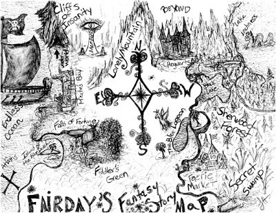 Fairday: I have been racking my brain about what map I want to talk about- there are so many! I knew Lizzy was going to chat about the Marauder's Map from Harry Potter, and I wanted one that would be as cool as that. I thought about all the maps I know of: Middle Earth, Hogwarts, Faerie realm, and so forth. Then I thought of The Mapmaker's Son's by V.L. Burgess . I enjoyed both the story and the illustrations of the five kingdoms. I decided that it would be fun to make up my own map using some of my favorite places from stories. Check out Fairday's Fantasy Story Map...