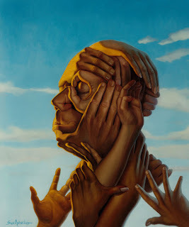 Unity by Dave SanAngeloYou have produced many spectacular paintings, which piece did you enjoy working on the most? Thanks!! That's very kind of you! My favorite painting is called Unity. It's a head made from all sorts of hands... men, women, kids... and each a golden tone. My original idea was to use all different skin tones but the patchwork of tones didn't feel right visually so I went with an overall golden tone. To me that golden color is the perfect skin tone. It could pass as any ethnicity and at the same time represents the perfect tone if all races were mixed and that went with the overall idea of unity.
