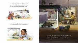 Alfie the Turtle Who Disappeared by Thyra Heder is a picture told from a little girl’s point of view, and then from her pet turtle’s point of view. I love the dual POVs, as that is where the magic comes in. Nia gets Alfie on her sixth birthday, and he is six too. He is a good turtle, if a little quiet. Nia taught him all kinds of tricks and kept him entertained with stories. But on her seventh birthday Alfie disappears. From here the story switches to Alfie’s side of the story and we see where he went and what he is doing. I loved this part and was curious how it would all end. I thought the last page of this book was genius, and it’s important that readers look very carefully so all the pieces of the puzzle will fall into place. I don’t want to ruin it for you- but I know Margo missed it the first time.