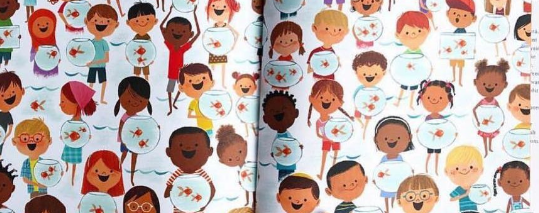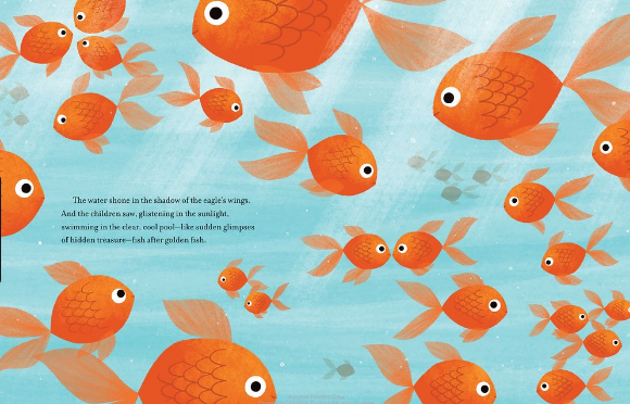 Goldfish on Vacation by Sally Lloyd-Jones is a fun story about three siblings who each have a goldfish. They live in a small apartment in New York City and summer vacation is coming. The kids aren’t going away, but a lot of their friends are leaving the city over the break. Right around that time, the vandalized and crumbling fountain near their apartment begins to be repaired by a man who is making it look beautiful. Not only that- but a sign goes up asking people to bring their goldfish to the fountain on a specific date so they can go on “vacation”. How exciting! People flock to the fountain and the man helps them put their fish in the water. Each day kids go to the fountain to visit their fish and this gives them the chance to play with other kids who are doing the same thing. At the end of the summer everyone will need to collect their fish when it is time to go back school.