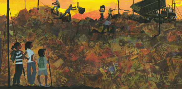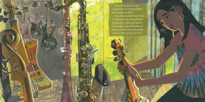 The bright colors and textured illustrations really draw in the reader. My sister, Margo, was intrigued by the images. The recycled instruments and scenes were enhanced by the collage style used to create the pages. My heart goes out to the people who live in Carteura, and I know how upset I get when I see litter, so I can only imagine how hard it would be to see so much garbage everywhere. I loved learning how music and the creation of instruments from the materials they salvaged changed their lives. The kids worked hard and learned how to make music, and even though it was not easy, they didn't give up. Their perseverance ended up being able to change their village and the lives of many people in it. Together they made our planet prettier and filled it with good tunes. So often we want something brand new from the store, but if we reuse and recycle, there is less waste and we can help make our planet a more beautiful place.