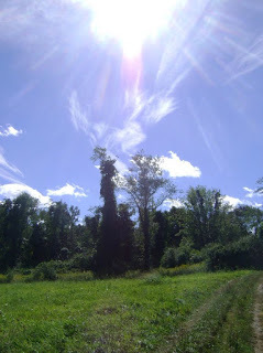 He casually makes his way to a neighboring meadow. Sunlight cascades over green hills, sprinkling prism rainbows on the scene. The butterfly stretches his wings and soars in.