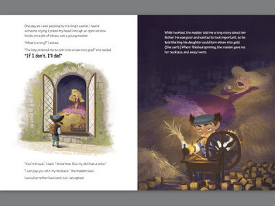 Excellent guessing, Riddlers! This week we're turning straw into gold. Margo has a children's picture book to share that will keep you spinning, so stay tuned! See you all around the book block. ; ) ~ FA child is my desire, hands to clean and stoke the fire. I peer into shadow light and hear a woman's woeful plight. Skip a jig on little legs! I've found a basket with some eggs! She can't do what's she's told, but the king insists he wants his gold. Should she fail, end is near. For a trade, I'll spare her tear. I'll dance right in and spin the stuff, then take what's mine soon enough.