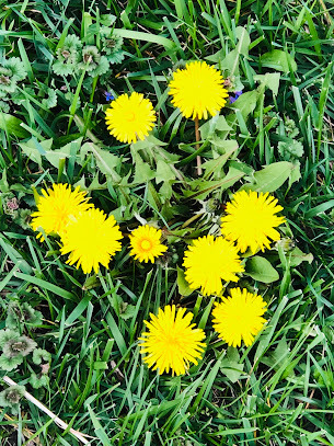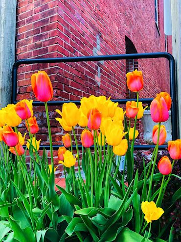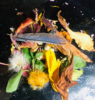 "Spring Bouquet"A deeper peep at the colors on the street. Materials used: tulips, bleeding heart, feather, mushroom, dandelion, sage, magnolia, violet.