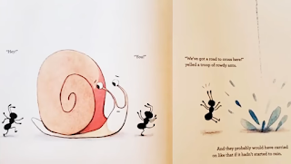In the story, Snail see delicious looking cabbage across the road. It looks far, but Snail isn't about to let that stop him. He scoots off. It's hard work crossing the road, and Snail needs to rest. There's a loud rumbling and the road shakes, but he's okay. Some antsy ants want Snail to move out of their way, and then it starts to rain. Of course, Snail offers them shelter in his shell, and they all have a nice chat about things that make them antsy, like cabbage. Once the weather clears Snail is back on his way- but there are even more obstacles in his way. Will Snail make it to the cabbage?