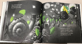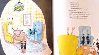 We took home It Fell From the Sky by The Fan Brothers and began reading right away. In the story, a mysterious item lands in the grass, and the insects are amazed. What is it? Where did it come from? They all have their own theories. Then the spider claims it as his, and he tells his friends that together they will build a place called WonderVille where other insects can come and see this curiosity. It takes a long time to build, but the exhibit is a hit. Ticket prices increase, the lines get longer, and Spider gets richer. He doesn’t notice that all the rest of his friends have left until a creature comes and snatches the item. Now what will Spider do? Where is everyone? He had been selfish, and now the garden is trampled and he's alone. Will Spider's friends come back?
