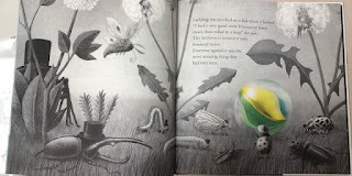 The illustrations in this book are beautiful. The way the marble stands out is magical and it makes it easy to see why the insects were mesmerized by it. The story made me want to take out my marbles and look at them closely. Which is what I did with Margo- showing her the colors and designs under my magnifying glass. We even went out and explored the lawn to see if our insects had any curiosity shows happening. None we have found so far, but we will keep looking.