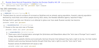 Kind of a subset of propaganda, but a fair point. I do think there were plenty of excess deaths there and that plays into Putin's acts. But what this doesn't deal with is the US and its million+ excess deaths and thus a similar need to distract the population. [3]A better discussion is here. Points to Putin posturing (there was an essay he wrote that was concerning, but from which he's backing off right now, and saying just that NATO wouldn't get into Ukraine) because of his lack of popularity (definitely true, especially with Covid). And the people here are smarter as they know that this game of chicken (again, with nukes) simply increases tensions and isn't good for anyone. Anyone who's sane.