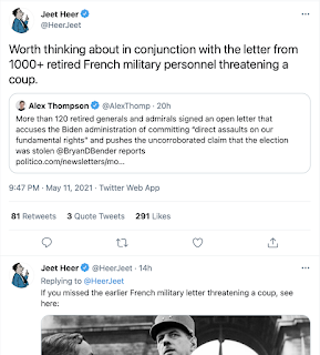 Thinking about those ex-generals and wondering how close they are to power or money or weapons and a bunch of batshit rednecks who are all sipping from the Q train. Will they be able to do at least a little damage? Are they at all associated with the pipeline thingie? Well that's going too far and there's no evidence, but I'm wondering what the breakdown of these generals is... It's manure like this can be fuel for worse.
