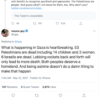 Lobbing rockets back and forth is not at all what's happening. War isn't it either. It's one sided all the way. Though at least Roxane Gay here points out the disparity in deaths. No one is even mentioning anything outside of normal East Jerusalem expulsions. Nor is anyone mentioning that there have been peaceful protests by the Palestinians before and currently. Whole bunch over there at LGM are going on about the lack of a Gandhi. Come on, liberals, read a little. Here's a solid breakdown (listen to it at 1.25 or 1.5 speed). It's a lot but it's worth it.