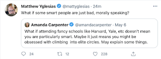 Also, here's an example of the lady doth protest too much. I went to an Ivy. Really good times and I learned a lot. And plenty of smart people there, but what does that mean? Seriously? This is in a society that truly values "it's not what you know, it's who you know." We've already heard about people bribing their way in. And that actually might be a legit part of any college's admittance system given that we live in an age of grift. IOW get the rich kids to mingle with some super smart kids and you have better numbers in terms of outcomes and being able to fund good ideas.