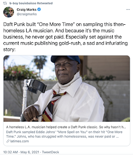 Oh, and by grifting, I mean this. Where the person who's picked clean like a carcass by a vulture, the creator, doesn't get squat but going in and out of homelessness. So it goes.